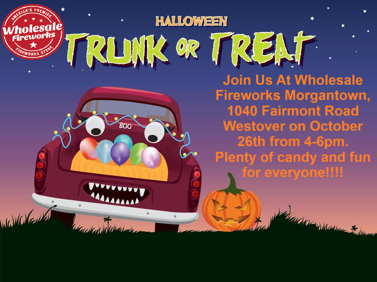 Trunk or Treat at Wholesale Fireworks Morgantown. We will have candy and games for all. Contact Caressa if you would like to participate as a trunk to hand out treats!
